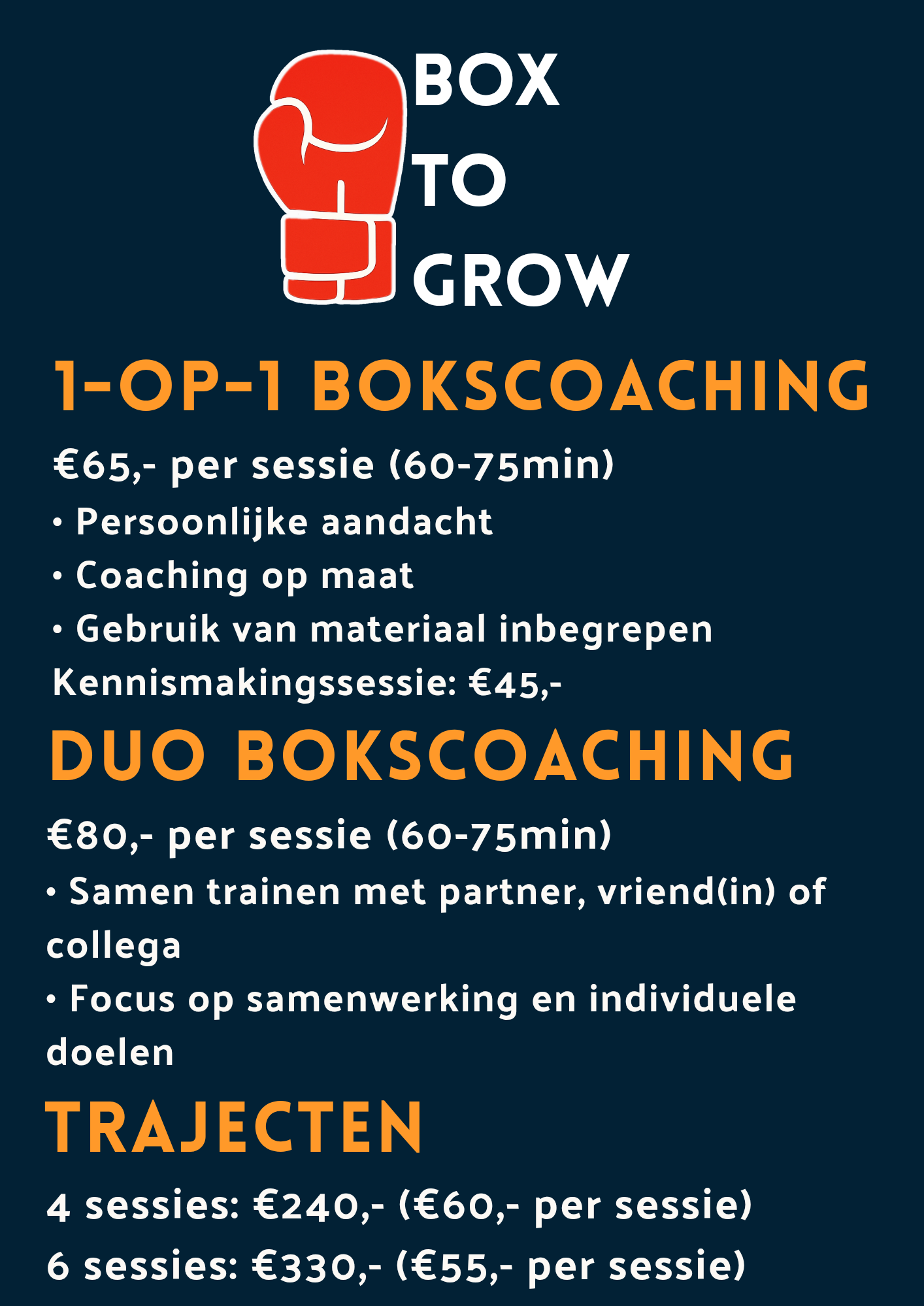 Een individuele sessie kost €65,- en duurt 60-75 minuten. Voor €45,- kun je starten met een kennismakingssessie waarin we direct gaan bewegen en samen ontdekken wat Box to Grow voor jou kan betekenen.